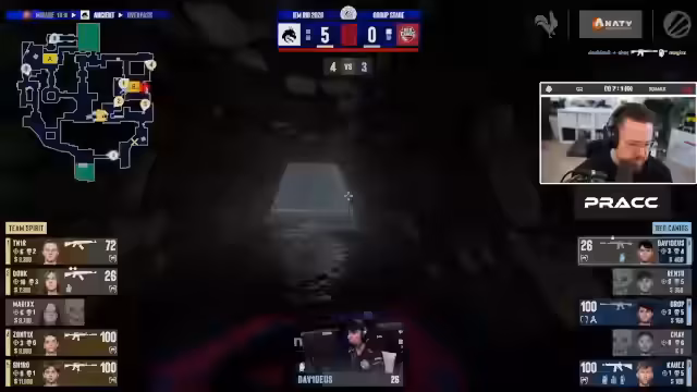 01:56:59Auf der zweiten Map Overpass startet Team Spirit dominant und führt schnell mit 6-0. Die Red Canids zeigen Schwächen in der Taktik, besonders in der Mitte und auf der B-Site, wo sie keinen nennenswerten Druck aufbauen können. Donk ist auch auf dieser Map in exzellenter Form und führt Spirits Offensive an. Die Canids müssen ihre Strategie anpassen, um nicht auch auf dieser Map eine klare Niederlage einzustecken.