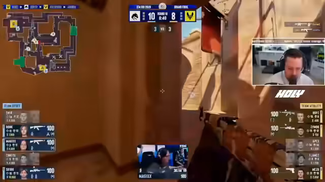 01:00:10Nach der ersten Hälfte der Map Ascent werden die taktischen Schwächen beider Teams genauer analysiert. FURIA muss auf der CT-Seite deutlich aufsteppen, um das Spiel zu drehen, während Falcons versuchen, ihre Vorteile weiter auszubauen. Der Streamer diskutiert die wirtschaftlichen Entscheidungen der Teams und den Einfluss von Coach-Wechseln in der Szene. Zudem gibt es eine kurze Diskussion über die Zusammenarbeit mit Sponsoren wie Holy und deren Produkte, die während des Streams präsentiert werden.